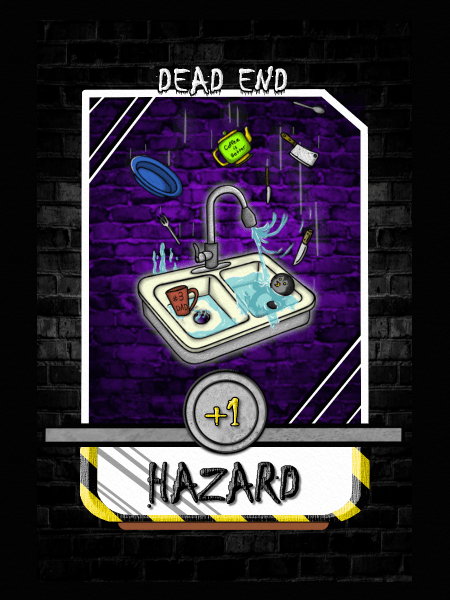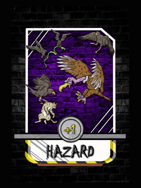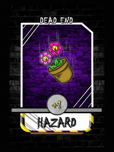 Hazards will affect the game board when they first enter play. 1 circle means it’ll affect the first space of the alley it was drawn from. 2 circles means it’ll affect the second space. The number inside those circles determine how much damage it’ll do to the card it strikes.
