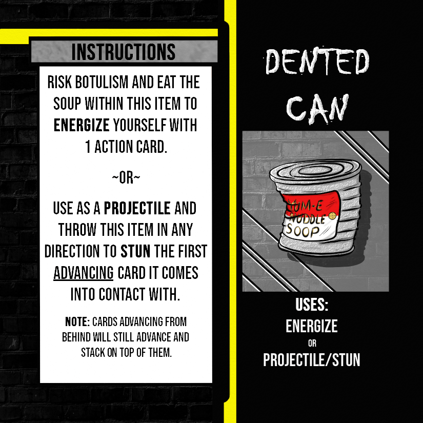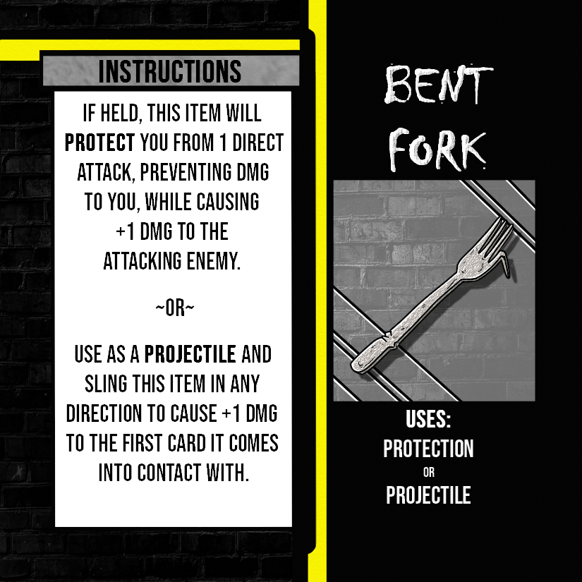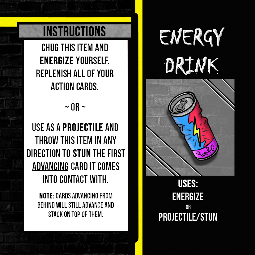 ITEMS are randomly drawn from a deck after defeating an ENEMY card with “ITEM” written on it. Most ITEMS appear useless, but beggars can’t be choosers, making them uselessly useful!